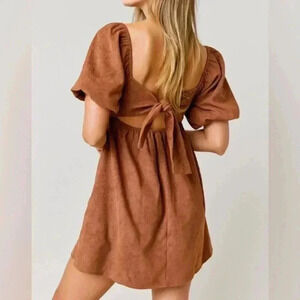 Women’s Med Brown Corduroy Fall Mini Dress Feminine Above The Knee Bow Back