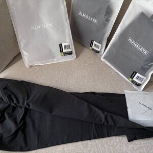 Item are brand new, and I have three available. I took items out of the package to take a picture and to check if leggings looked okay. Please only order if you know these will fit you. No returns. Thanks, they're brand new. Items are still in their original package. Alphalete leggings don't come with tags on the leggings, just the paper wrapping. The color of these leggings are Shadow, looks like a light black color. Size medium is currently sold out on the site.