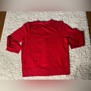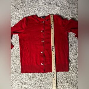 Stylish red cardigan featuring unique bow buttons. Perfect for layering.