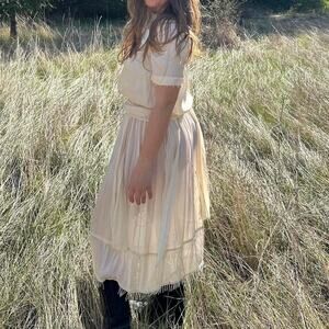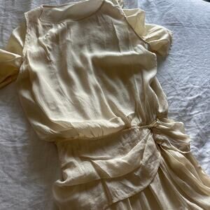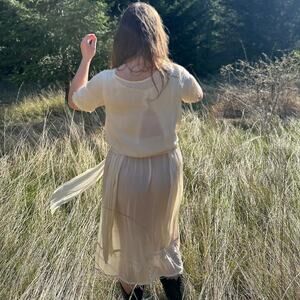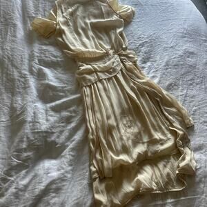Romantic vintage antique edwardian early 30s cream dress featuring flutter sleeves, drop waist, and soft draped construction. Crafted from a delicate silk with light embroidery detailing, and a high-low hem. Has beautiful flow and movement. Unlined and slightly sheer. Best fits women’s small/medium.