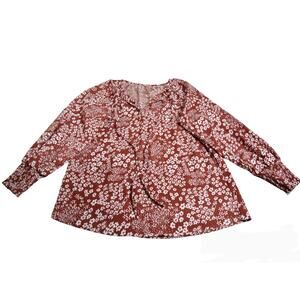 Women's Medium Floral Tunic Red & White Long Sleeves V-Neck With Tie