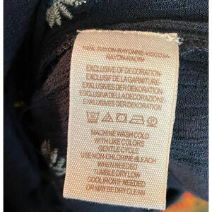 This women's crop top by Free People features a floral pattern with embroidered accents, perfect for a casual occasion. The navy blue color and 3/4 sleeves add a trendy touch to the boho style blouse. Easy to care for with machine washable fabric, this top is ideal for the summer, fall, and spring seasons. With a button closure and cropped design, this top offers a comfortable fit in size M.