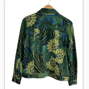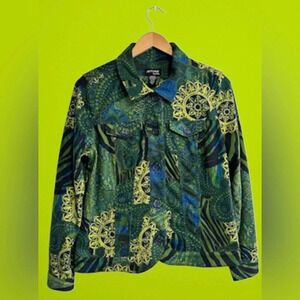 Women's Medium Green Blue Button Jacket Funky Artsy Gothic Animal Print Paisley