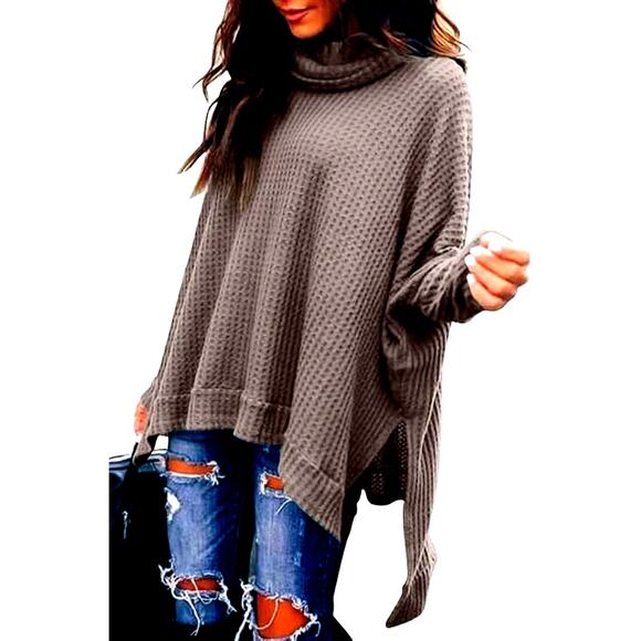 Oversized Tunic Sweater Turtleneck Batwing Long Sleeve Waffle Knit Split Hem Pullover Top Khaki Grey Medium