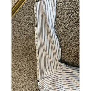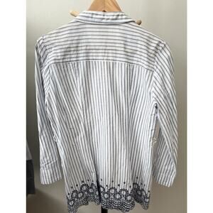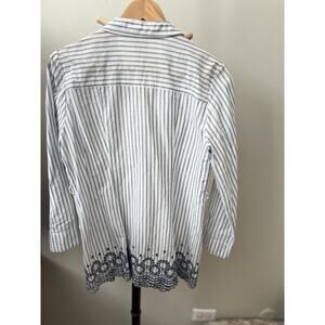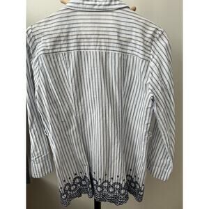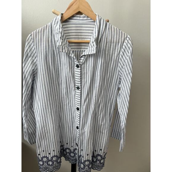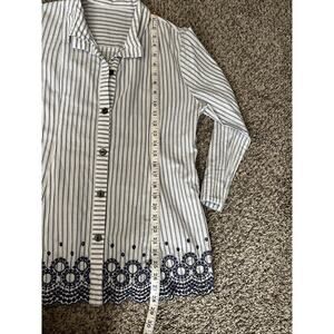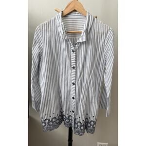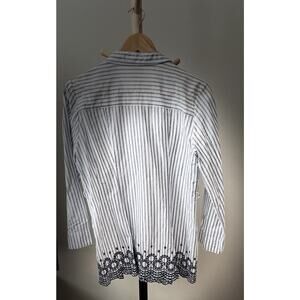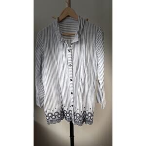 Womens Medium Linen Feel Top Long Sleeves Collared Striped Blue Embroidered