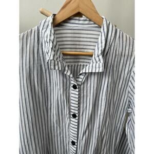 This women's medium linen feel top features a classic collared design with long sleeves and striped pattern in a blue color. Made from cotton, it offers a lightweight and breathable option for the summer and spring seasons. The button-up closure and regular fit make it suitable for various occasions such as travel, parties, workwear, and business events. With embroidered accents and easy care properties, this top combines style and comfort for everyday wear.
