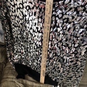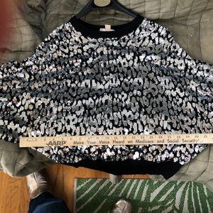 Black and Silver Leopard pattern in excellent condition. Worn once. Viscose. It's supposed to be an oversized M, but I normally wear a L or XL and because of the Dolman sleeves (23" pit-to-pit) I was able to wear it. Worn once, got lots of compliments. The photos don't capture how shiny and reflective it is. It's very shiny and reflective.