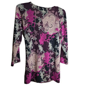 Women’s Medium Paisley Surplice Purple Black 3/4 Sleeve Ruched Stretch Top
