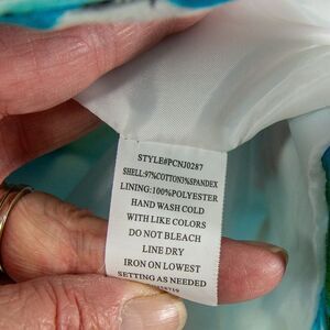 This women's blazer from NOTATIONS is a must-have for any fashion-forward wardrobe. The blazer features a Hawaiian print and a lightweight design that makes it perfect for any season. It is made of a spandex and cotton blend that provides a comfortable and stretchy fit. The jacket has a regular fit and is cut in a single-breasted style with two buttons on the front. The blazer is fully lined with 100% polyester and has long sleeves. It is suitable for various occasions such as travel, party/cocktail, workwear, and business attire. The garment care is hand wash only. This jacket is gently used in good condition. Length 23", pit-pit 19"