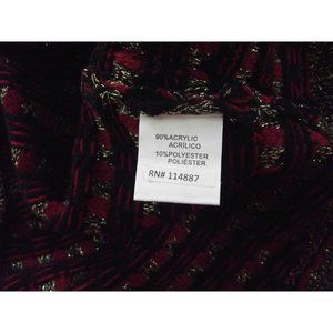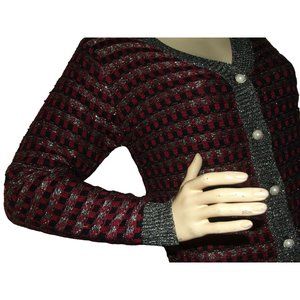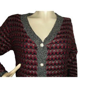 Fu Zade Women's Medium Red Black Gold Woven Plaid Acrylic Button Front Cardigan Sweater m