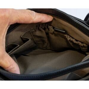 This Stone Mountain bag is made of black genuine pebbled leather. It is a 2 compartment purse with brown lining that is in great condition. It has 2 outside slip pockets that are the length of the purse and 1 smaller flap pocket. On the inside there is 2 slip pockets 1 that closes with velcro and 1 zip pocket. It has a key chain that snaps to the inside of the purse. There are double shoulder straps, gold hardware and a zip closure. 8.5" (H) X 11" (W) X 3.25" (D) with a handle drop of 12"