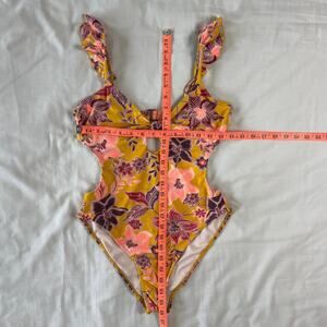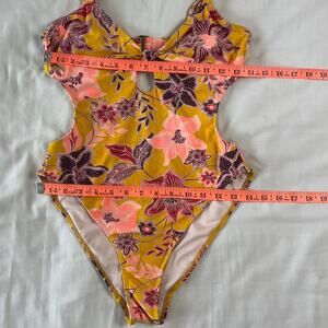 Picturing the orange floral one-piece swimsuit in size Medium.
