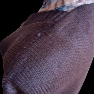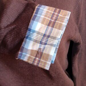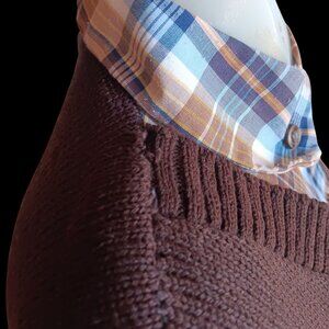 Layered-look sweater with a classic plaid collar and matching cuffs. Comfortable and stylish with a cozy feel, ideal for casual or semi-formal wear.