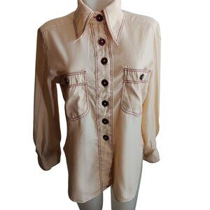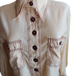 This blouse offers a retro touch with its contrast stitching and practical buttoned pockets. Tailored for a chic and vintage-inspired wardrobe.