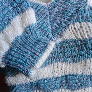 Soft and cozy women's sweater with a striped blue and white pattern. Its knitted texture and V-neck design enhance comfort and style.