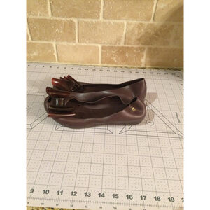 These are pre-owned Melissa brand ballet flats, size 38. They feature a dark brown, possibly rubber or synthetic material, with a decorative bow-like accent on the toe. The soles show signs of wear, with some dirt and scuffing visible. The interior also shows some wear. The shoes appear to be in fair condition, with cosmetic imperfections consistent with previous use.