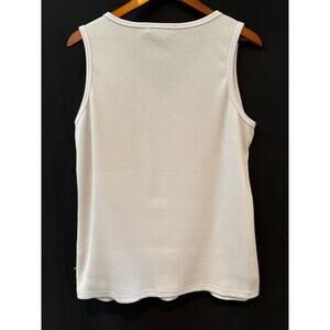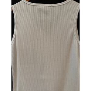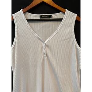 Sleeveless ribbed top in white with 3 snap front closure. Ribbed fabric. Cool, summery top that can be worn alone or layered!