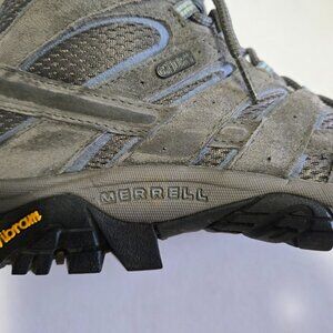 Women's Merrell Boots, Moab 2, Mid Lace-Up Hiking Boot in 'Granite'. Granite is a dark grey color with a blueish grey trim color. Lace closure, padded collars, excellent condition. US Size 8 1/2 .
