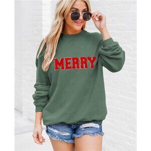 Merry & Bright: Cozy up in this chenille patch “Merry” sweatshirt, perfect for Christmas cheer. With its lightweight, breathable fabric, this sweater is ideal for holiday gatherings or everyday wear.