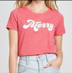 Women's Merry Short Sleeve Holiday Graphic T-Shirt - Light Red Size XL