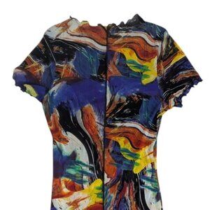 Women's mesh multicolor abstract short sleeve bodycon stretch dress.