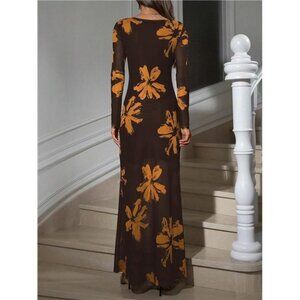 Women's Mesh Sleeve Maxi Dress Elegant Coffee