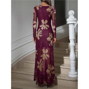 Women's Mesh Sleeve Maxi Dress Elegant Plum