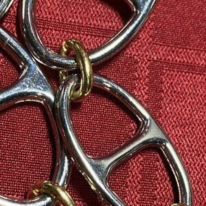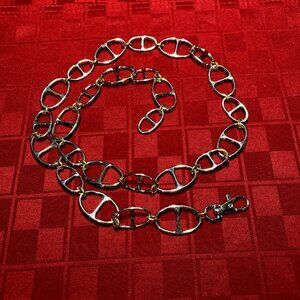 Cute shiny metal linked belt. It’s 50” end to end, but I think it’s cute with some of the links left dangling. Could also be used as a strap for a cross body (just add another clasp).