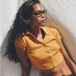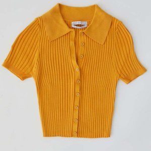 UO-exclusive ribbed knit sweater fitted with a full button-front closure. Topped with a pointed collar and short sleeves.