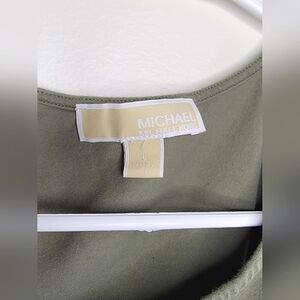 Good pre-owned condition. No rips, stains. There is one small fade spot (shown). Smoke free, pet friendly home. michael kors, cold shoulder, shirt, gold logo, short sleeve, crew neck, army green, large.
