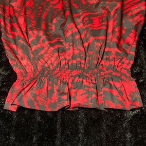 Michael Kors Red Peplum Top Black Print Cinch Waist Size Large V-Neck Work Shirt