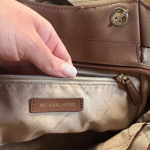 This is a pre-owned Michael Kors tote bag. The exterior features a brown monogram pattern. It has two side pockets and gold-tone chain detailing on the straps. The interior is lined with a logo-printed fabric and includes a zippered pocket. The bag measures approximately 15 inches in width. There are some signs of wear on the interior lining.