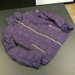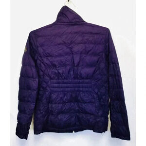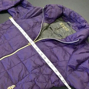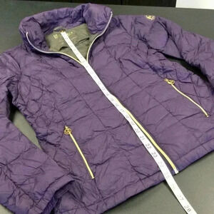 This is a pre-owned Michael Michael Kors packable down fill jacket. It is a size M and is made in China. The jacket is purple with gold zipper and accents. It has a stand-up collar and two zippered pockets. The jacket is quilted and has a slight sheen. The measurements are as follows: pit to pit 21 inches, shoulder to shoulder 17 inches, sleeve length 24 inches, and length 25 inches. The jacket is in fantastic condition with no visible imperfections. The tag states that some feathers may occasionally protrude through layers due to friction or static. This is a normal occurrence for this type of garment and should not affect the appearance.