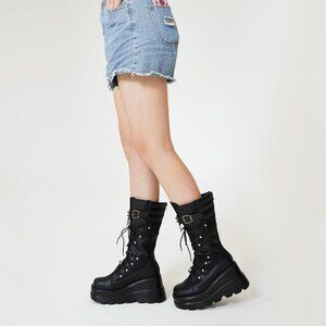 Women's Mid Calf Chunky Wedge Heel Rave Combat Lace Up Zipper Round Black Boot