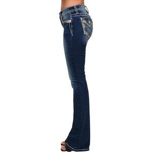 Features: Flattering mid-rise waist with a timeless bootcut silhouette. Eye-catching embroidered Azteca border-stitched design, plus pretty sequins, faux pearls, and rhinestone rivet accents for a touch of glamour. Made from a comfortable cotton blend, they’re perfect for casual days or dressing up.