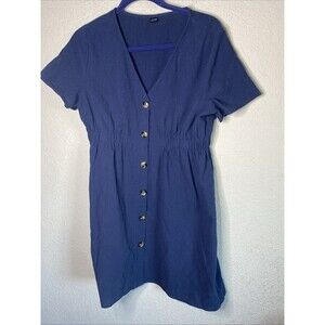 Super cute womens midi navy blue V-neck short sleeve dress with a full front button down. Super lagging and cottage core western country chore fall look. Super cute with leggings or for summer or spring wear with country boots to a festival or concert