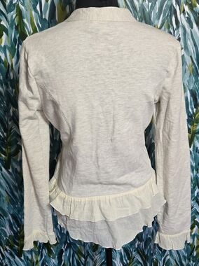 Classic ivory long-sleeve top with feminine ruffle trim. Front button closure adds polished detail. Soft knit fabric for comfortable everyday wear. Versatile ivory color pairs easily with skirts or jeans.