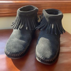 Like new condition! These black suede moccasins have rubber soles and a side zipper. Very clean inside and out. The only notable flaw I can find is a small mark in the suede, on the back of the left shoe. I’m pointing to it in my pictures. Otherwise, they’re like new. Any questions, please ask!