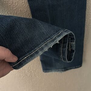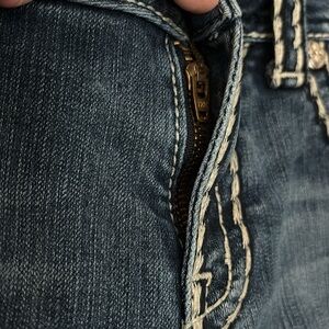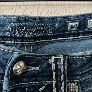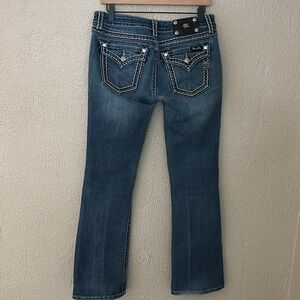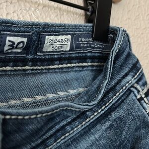 Women’s Miss Me Loose Saddle Stitch Border Boot Cut Jeans, 30” Waist Medium Wash