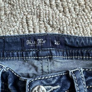 The product is a pair of women's Miss Me jeans in size 26 with a mid-rise and straight fit. Made from denim fabric with a medium wash, these jeans feature a 5-pocket design and a zip closure. The denim is accented with distressed detailing, studs, sequins, rhinestones, and embroidery, giving a unique and stylish look. With a comfortable stretch design and a classic blue color, these jeans are suitable for all seasons and can be machine washed for easy care. The brand is Miss Me, known for its trendy and on-trend denim styles.