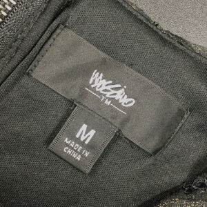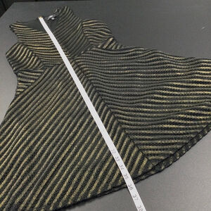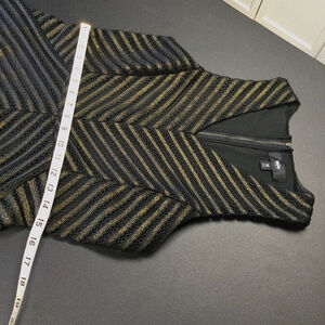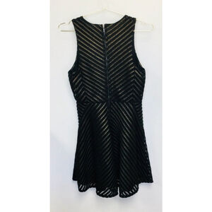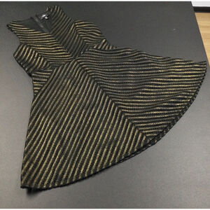 This is a pre-owned Mossimo brand dress, size M. The dress features a black and gold chevron pattern. It has a sleeveless design and a V-neckline. The dress is made of 100% polyester. A zipper closure is located at the back. The dress measures approximately 36 inches in length. There are no visible stains or tears. The dress is in excellent condition.