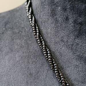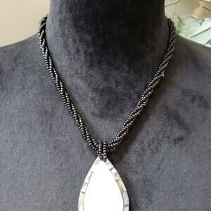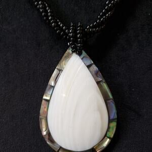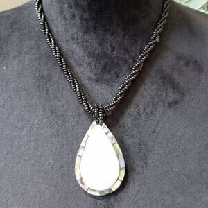 Womens Mother of Pearl Teardrop Black Glass Seed Bead Chain Pendant Necklace.