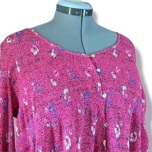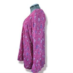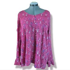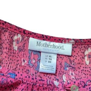 Women's Motherhood Maternity Bell Sleeve Floral Sheer Blouse, XL. Floral pattern with dots. Ruffle bell sleeve. Full button up. Sheer and stretchy material. Excellent condition. Measurements Flat Approx: Bust: 25", Hips: 31", Length: 30"
