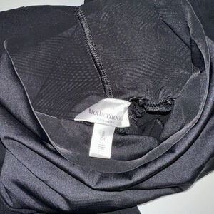 These are pre-owned black maternity pants from Motherhood Maternity, size small. The pants feature a full belly panel made of a stretchy, soft material. The lower portion of the pants is a woven fabric. There are two back pockets. The pants are in good condition with no visible stains or tears. The material may show slight signs of wear consistent with pre-owned clothing.