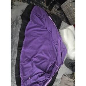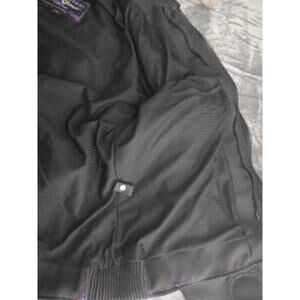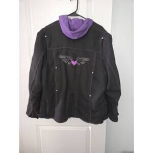 Milwaukee Performance women’s motorcycle jacket in excellent condition. Heavy-duty black textile with purple accents and embroidered wing/heart graphics. Comes with a removable purple hoodie-style liner.