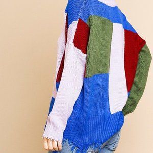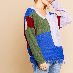 Women's Multi Color Blocked Long Sleeve V Neck Knit Pullover Sweater Size-L NWT