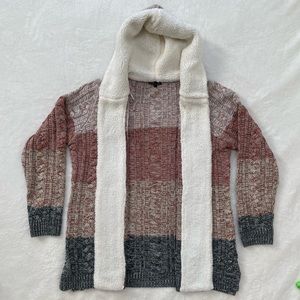 Lety & Me Sherpa trimmed hooded cardigan. Multi color big striped, long sleeved cardigan with open front. Sherpa lined hood. Size large. No holes or snags.