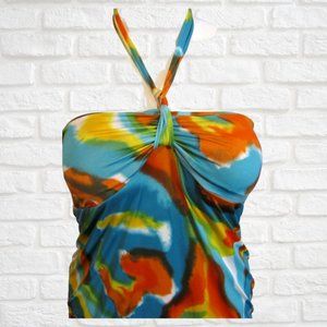 Women's Multi-Colored Dots Halter Top Size Large Super cute and in good condition. This top is blue, white, orange and yellow color. Has some ruching on the sides shown in the pic.