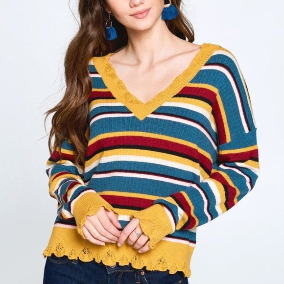 Women's Multi-Colored Variegated Striped Ruffled Edge Hem Knit Sweater a v-neckline, long sleeves, and ruffled edge hem details.