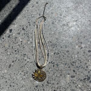 Statement boho necklace featuring a large circular gold pendant with amber-hued beads and rhinestone accents. Strung on layered strands of cord, suede, and shimmer rope in complementary neutrals. Layerable.